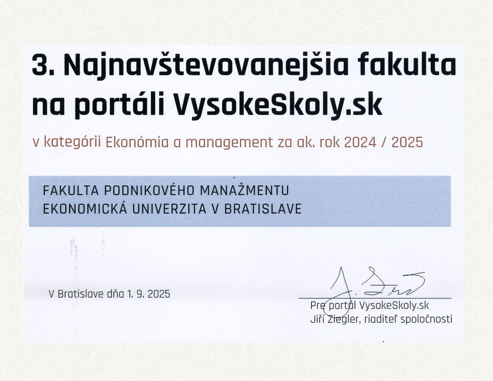 Na základe vyhodnotenia celorepublikovej návštevnosti profilov manažérskych a ekonomických fakúlt, sme od portálu VysokeSkoly.sk obdržali oficiálny diplom spolu s komunikačnými nálepkami, ktoré nás oprávňujú verejne sa prezentovať ako ocenená vzdelávacia inštitúcia.