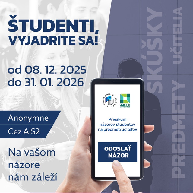 V období od 8. decembra 2025 do 31. januára 2026 je spustená študentská anketa, ktorá vám umožňuje vyjadriť svoj názor na učiteľa a predmety, a po novom aj na SKÚŠKY, ktoré absolvujete v zimnom semestri akademického roka 2025/2026. Preto neváhajte a využite túto možnosť. Anketa je ANONYMNÁ a je vám sprostredkovaná cez AiS.